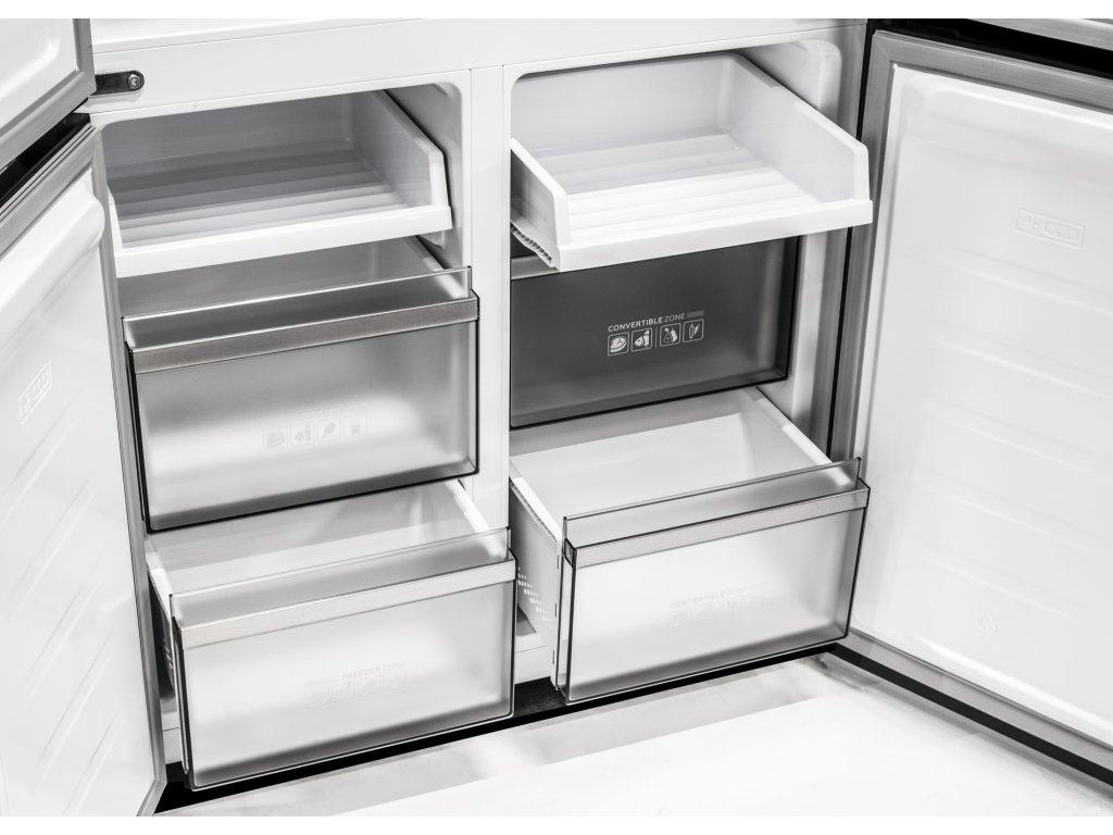 Funkce Multi-Flow Air Tower zajistí dokonalou cirkulaci vzduchu a vyrovnávání teploty v některých částech chladničky. Potraviny můžete umístit do celkem tří polic z bezpečnostního skla, přičemž jedna z nich je výškově nastavitelné. Ve dveřích chladničky najdete celkem šest polic.