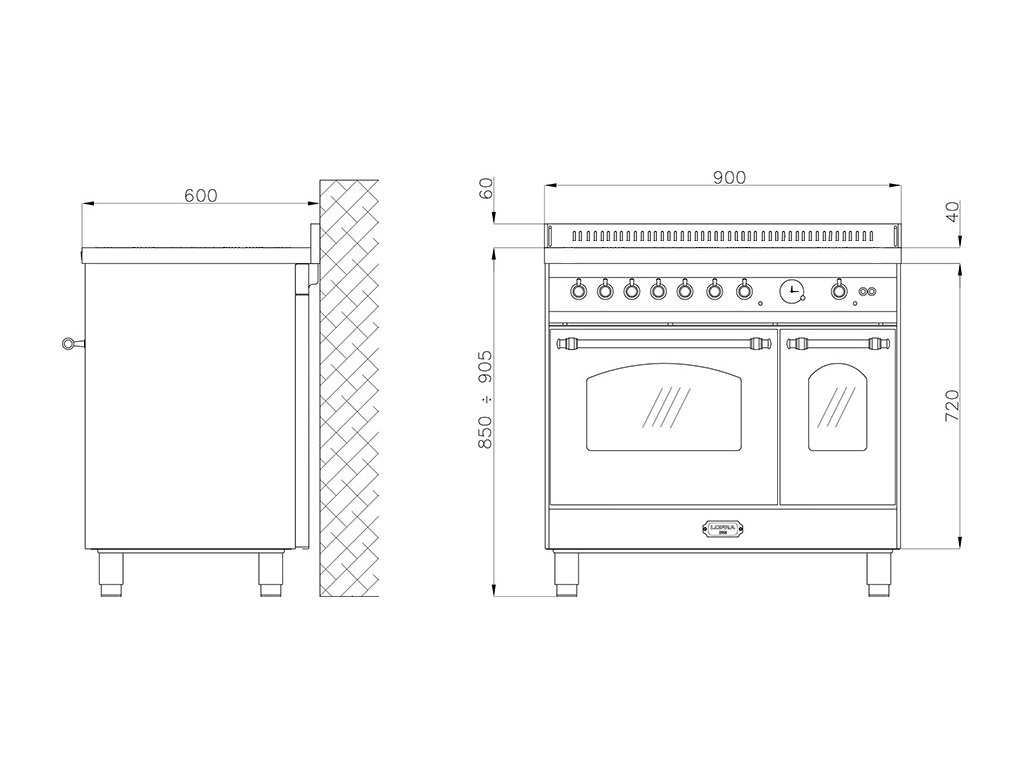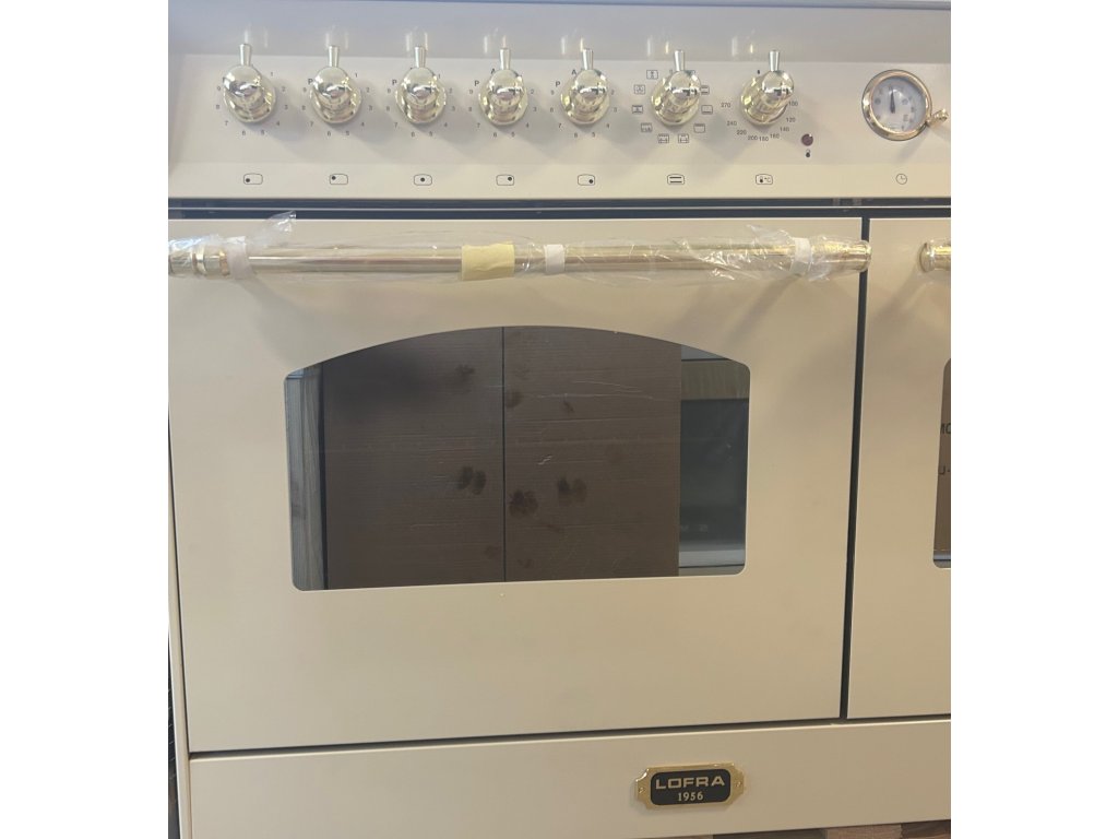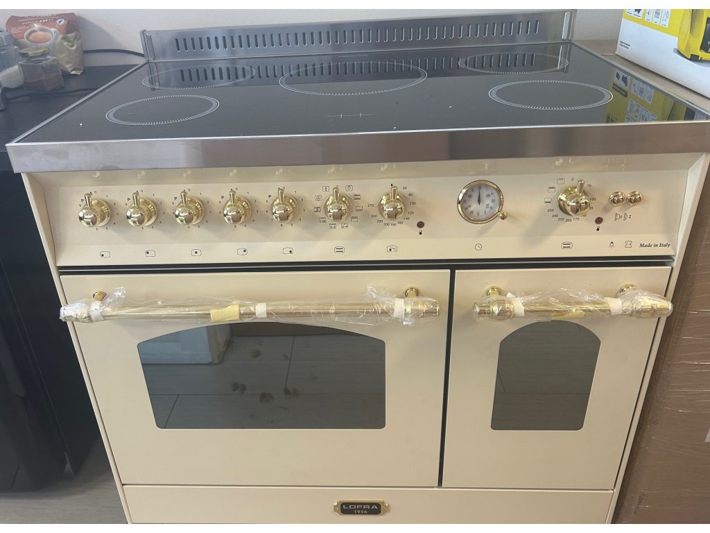 Retro sporák s indukční deskou Lofra RBID96MFTE/5I, volně stojící, indukční deska a dvakrát elektrická trouba, barva krémová, doplňky zlatá, šíře 90 cm, 2 úrovně teleskopických výsuvů v hlavní troubě, 5 indukčních zón, tangenciální chladicí systém, hrubý objem hlavní trouby 72 l., hrubý objem přídavné trouby 35l., energetická třída A.
