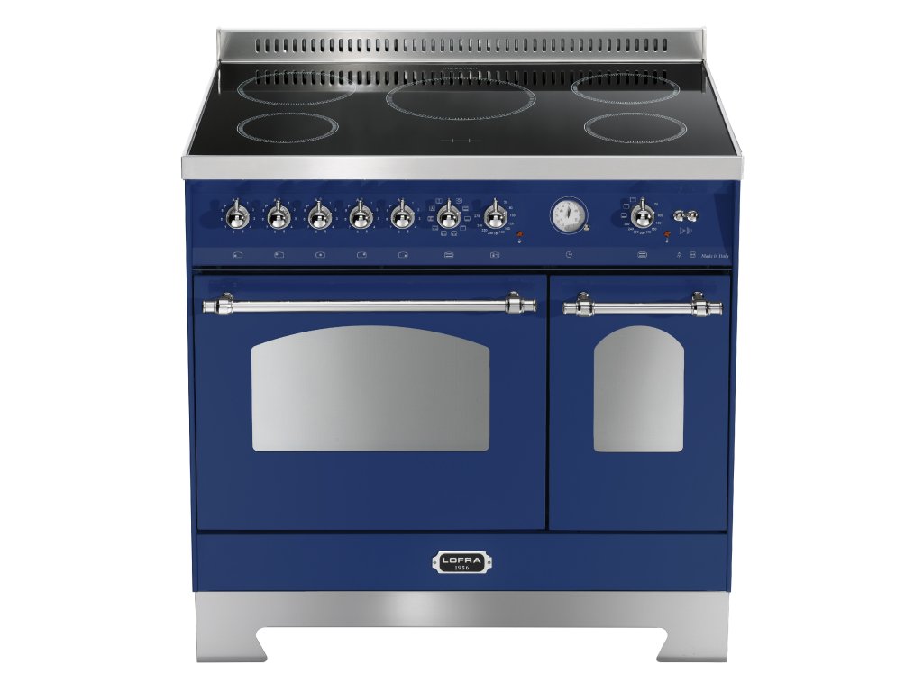 Retro sporák s indukční deskou Lofra RBLD96MFTE/5I, volně stojící, indukční deska a dvakrát elektrická trouba, barva modrá, šíře 90 cm, 2 úrovně teleskopických výsuvů v hlavní troubě, 5 indukčních zón, tangenciální chladicí systém, hrubý objem hlavní trouby 72 l., hrubý objem přídavné trouby 35l., energetická třída A.