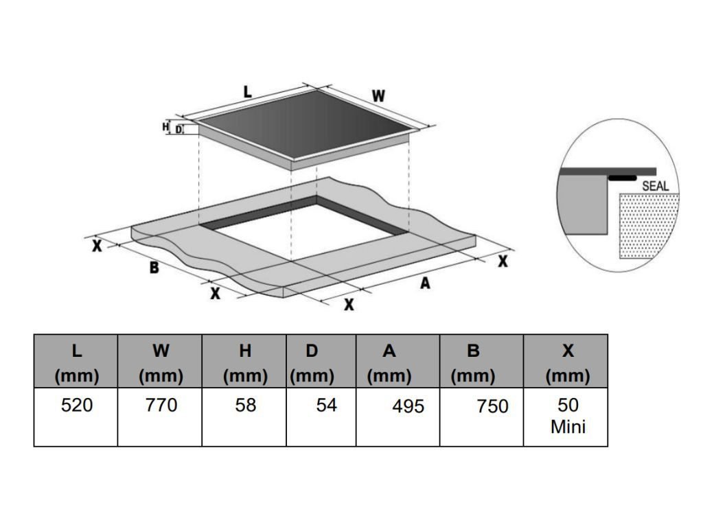 - Rozměry varné desky VxŠxH v cm: 5,80 x 77,00 x 52,00
