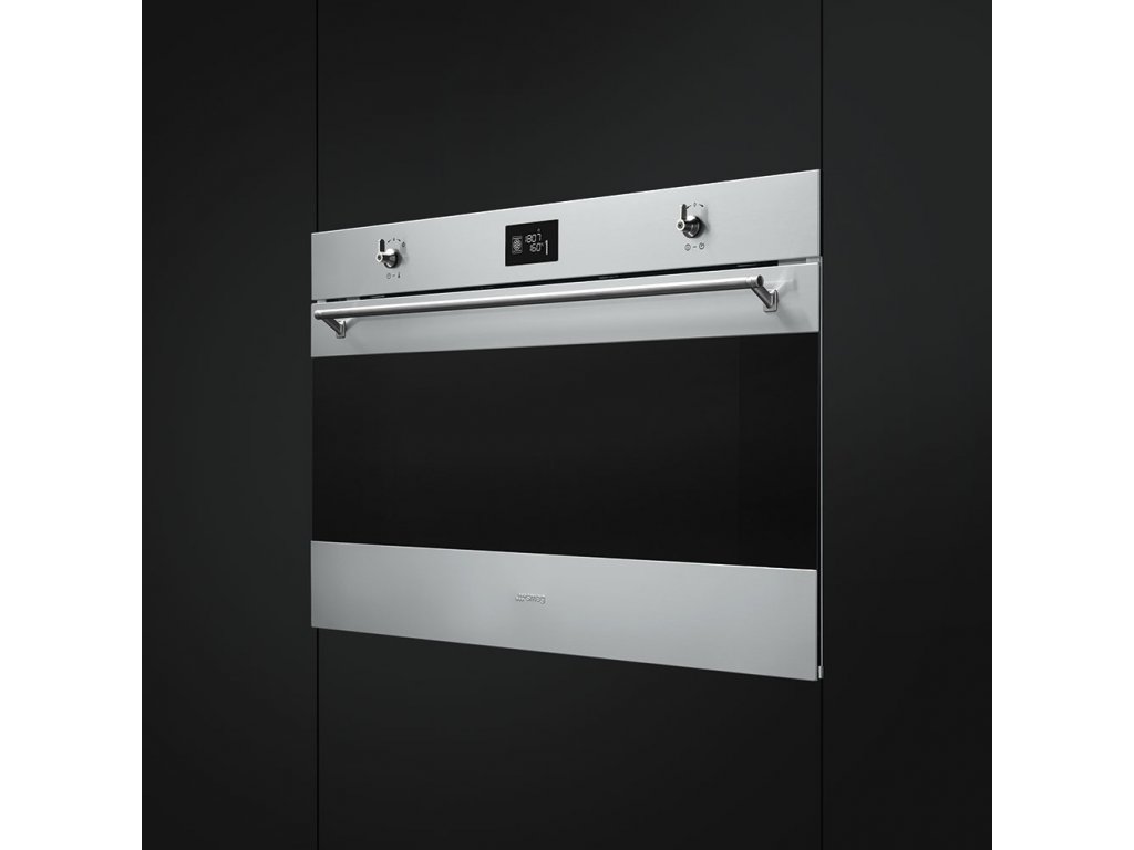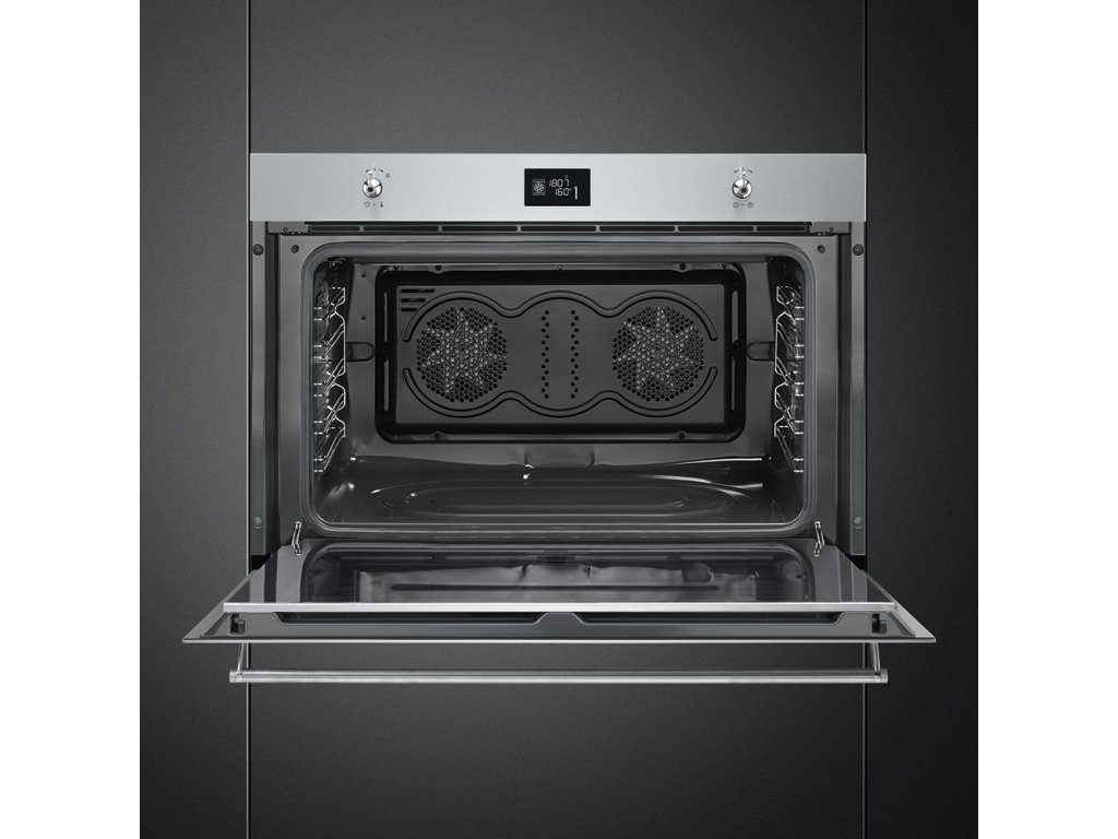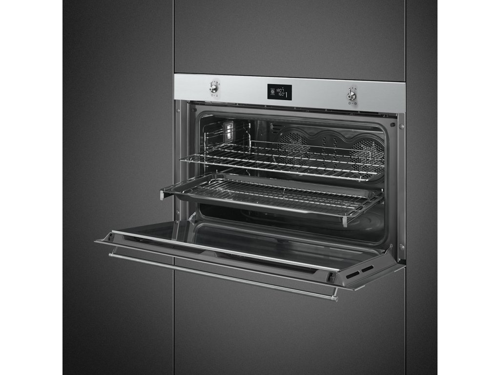 - Smaltovaný interiér: Smaltovaný interiér všech pecí Smeg má speciální antacidový povrch, který pomáhá udržovat interiér čistý snížením množství přilnuté mastnoty z vaření. Vnitřní prostor trouby má 5 různé úrovně vaření.