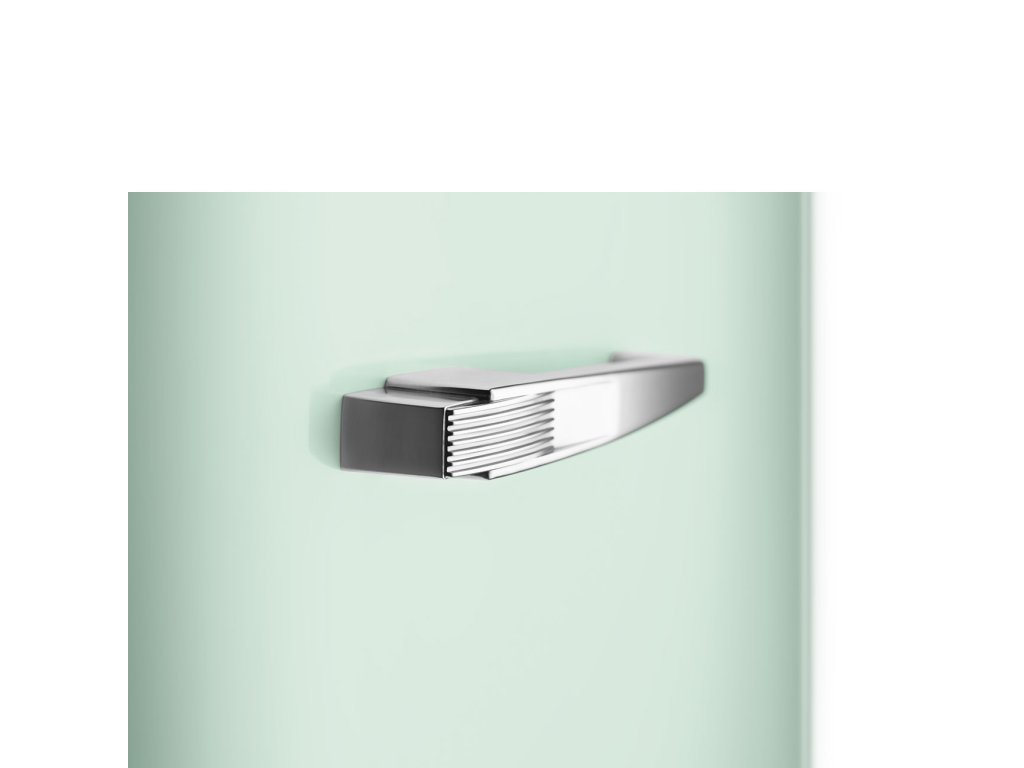Přihrádky na dvířkách a skleněné police jsou elegantně osazeny lesklými chromovanými profily. Decentně to podtrhuje retrostyl chladničky.