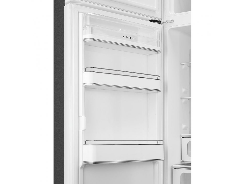 Kombinovaná chladnička Smeg FAB30LWH6 s mrazákem nahoře. Lednice patři do designové řady značky Smeg 50's Style Retro. Chladnička je energetické třídy C.