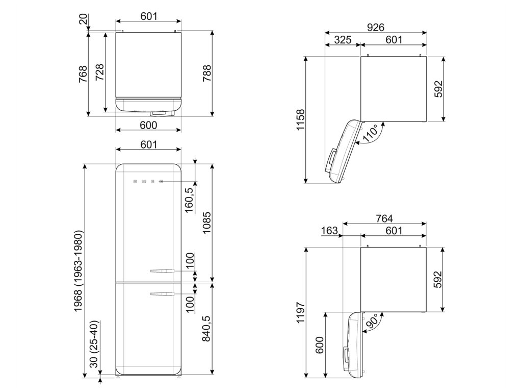 - Hloubka výrobku s otevřenými dvířky 90°: 1197 mm
