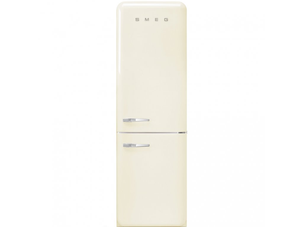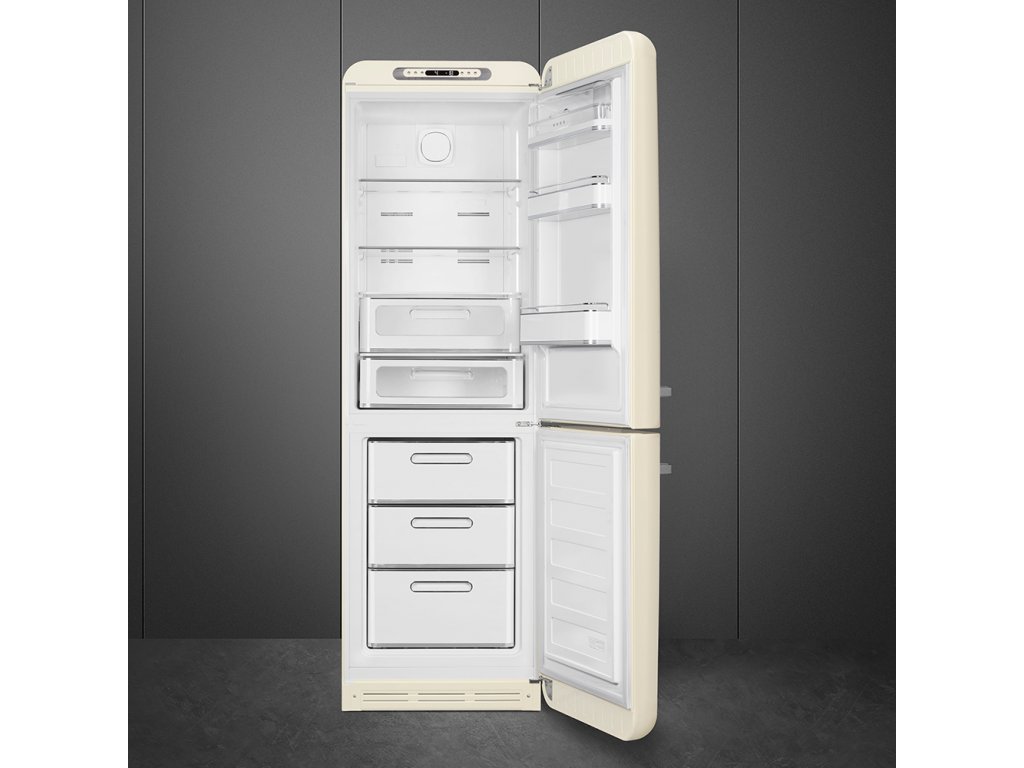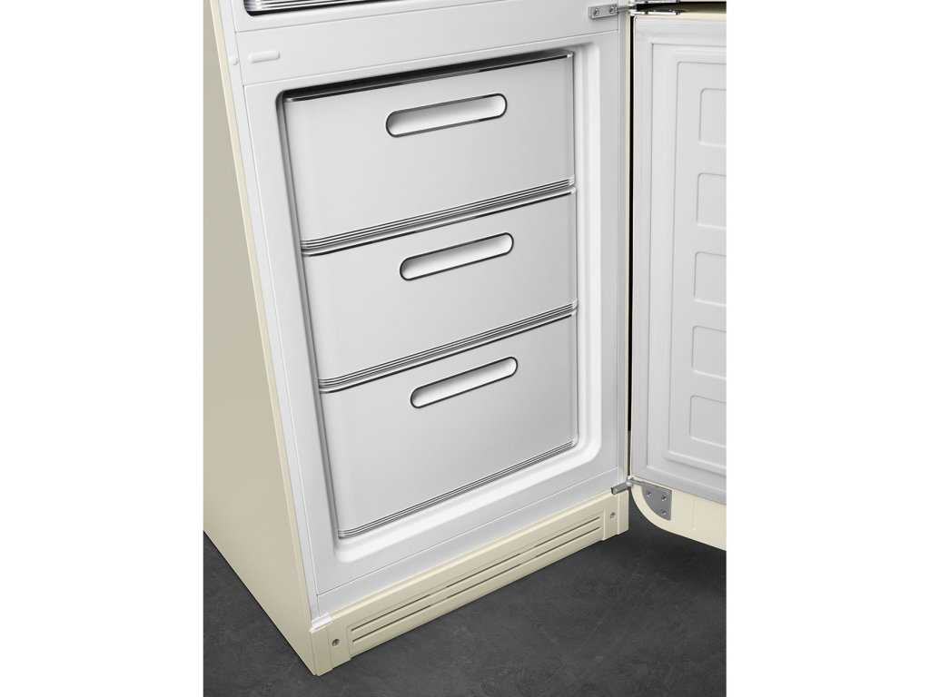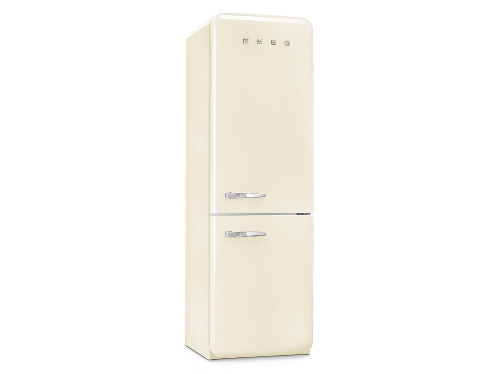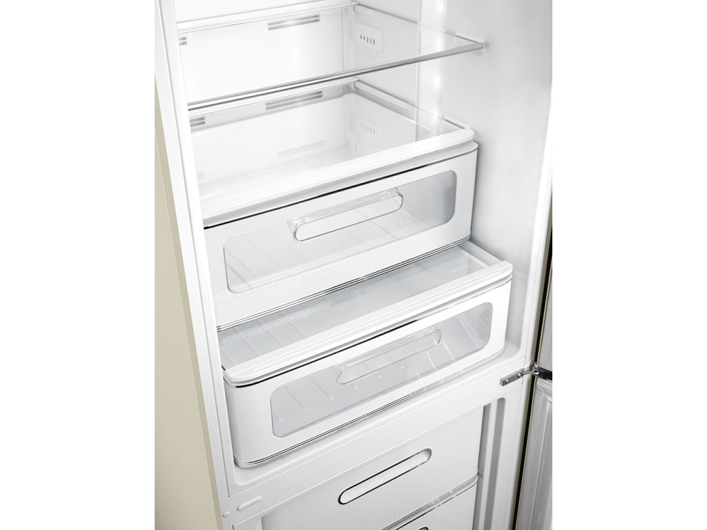 Přihrádky na dvířkách a skleněné police jsou elegantně osazeny lesklými chromovanými profily. Decentně to podtrhuje retrostyl chladničky.