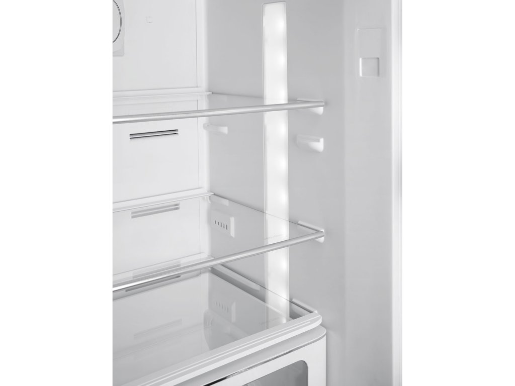 Přihrádky na dvířkách a skleněné police jsou elegantně osazeny lesklými chromovanými profily. Decentně to podtrhuje retrostyl chladničky.