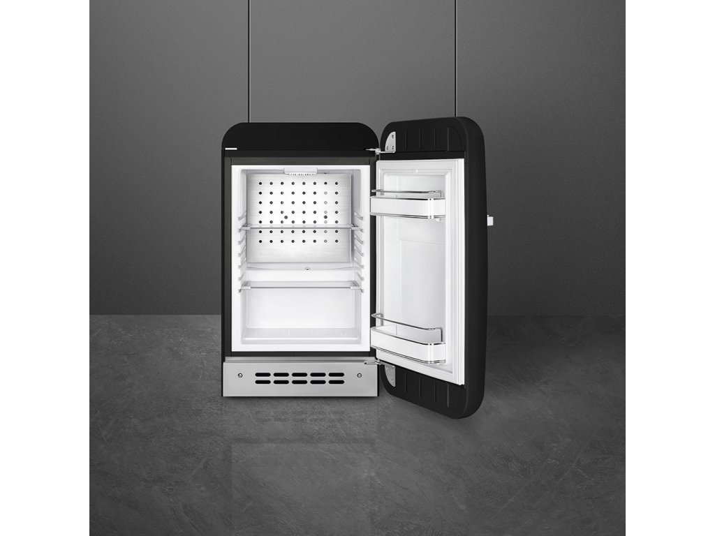 Chladnička Smeg FAB5RBL6, je minibar bez mrazáku, barva černá. Užitný objem chladničky je 34 litrů.