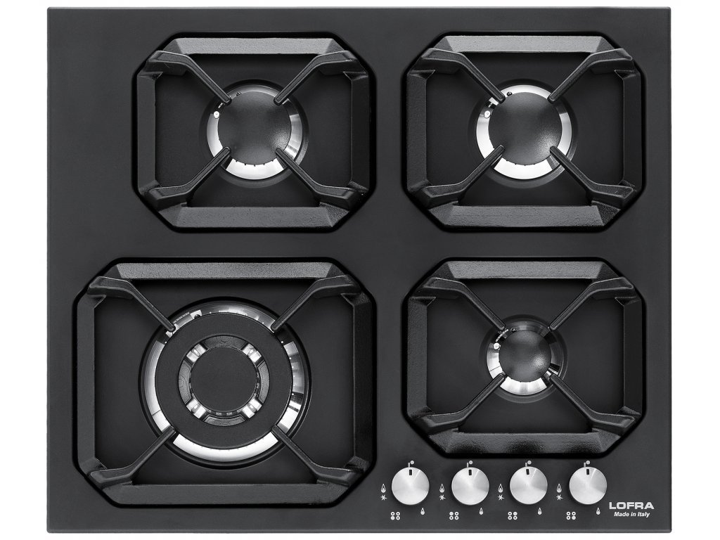 Plynová varná deska Lofra HLNM6G0, šíře 60 cm, vestavná, barva černá, doplňky nerez, 4 hořáky z toho 1 turbo, ovládání knoflíky v předu. Rozměry výrobku (mm): 598 x 508 x 45 mm.