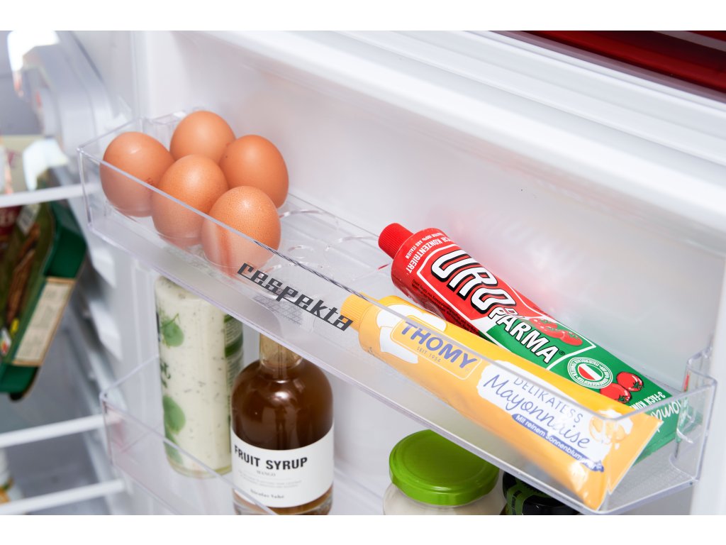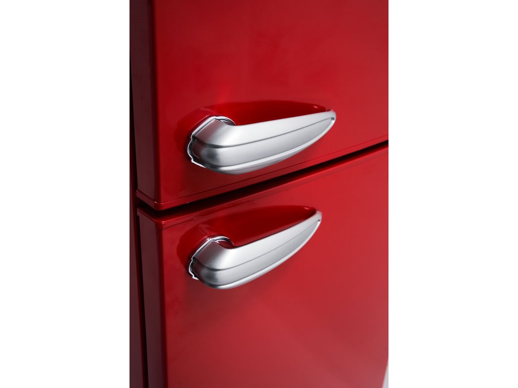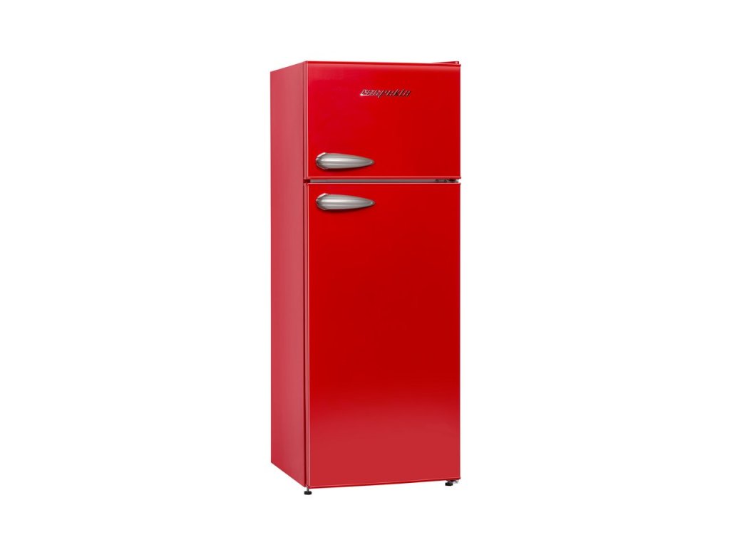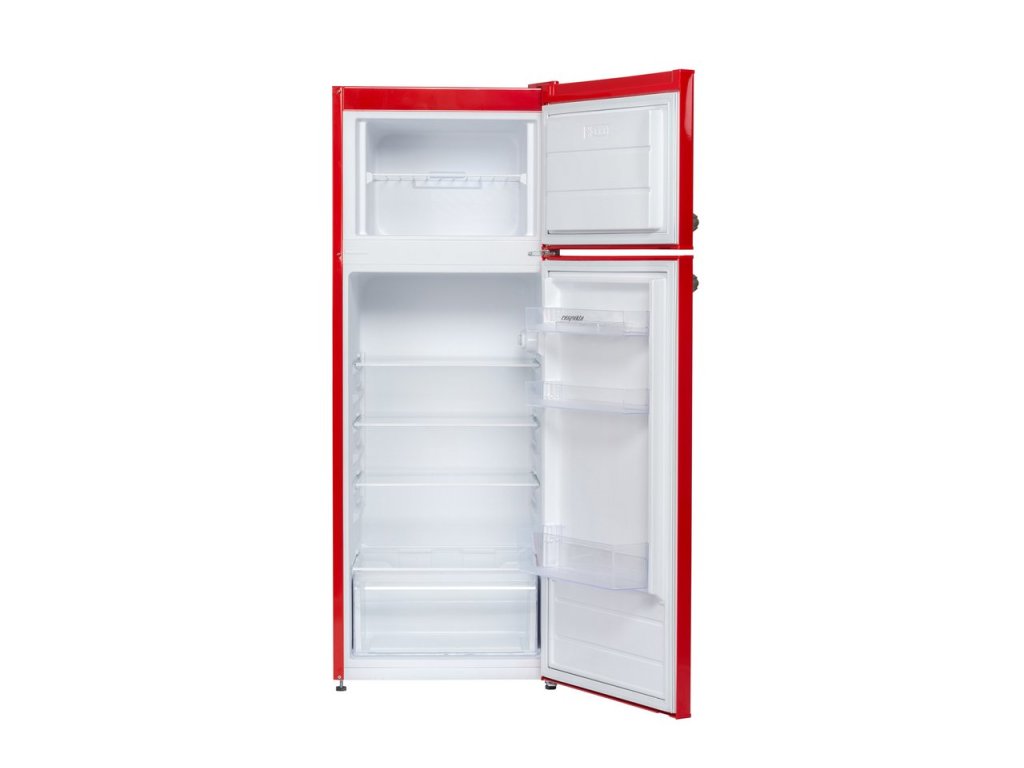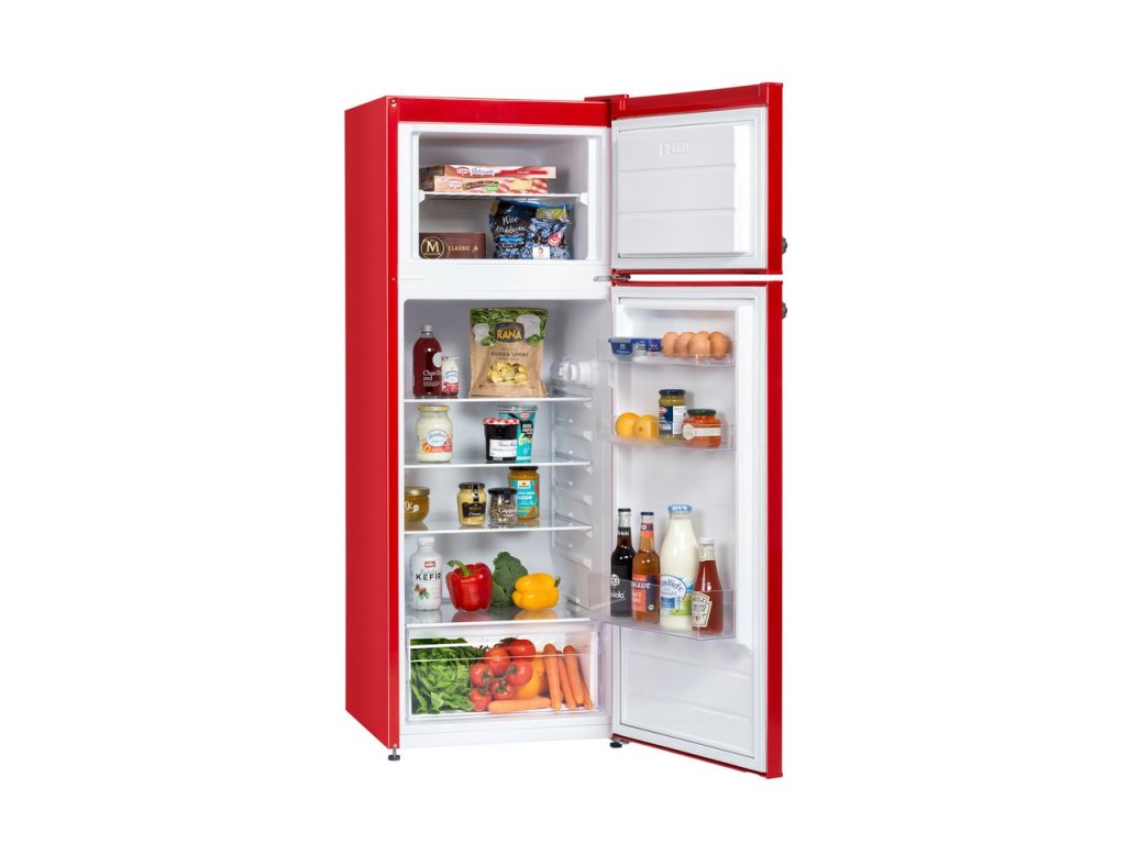 Červená kombinace chladničky a mrazničky Respekta KS 144 VR zaujme svým stylovým, vysoce kvalitním designem a robustními chromovanými kovovými dveřními madly.