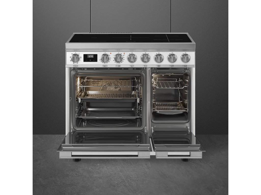 Prostorný a všestranný sporák ideální pro přípravu několika jídel najednou, vybavený elektrickými troubami a indukční varnou deskou: dokonalá syntéza stylu, kvality a technologie díky homogennímu a okamžitému ohřevu, maximální bezpečnosti a ohleduplnosti ke spotřebě.