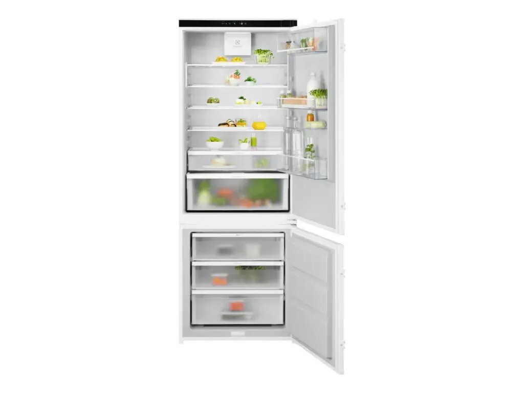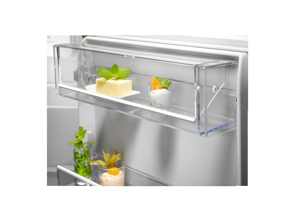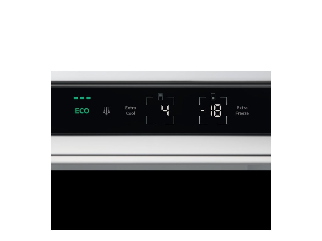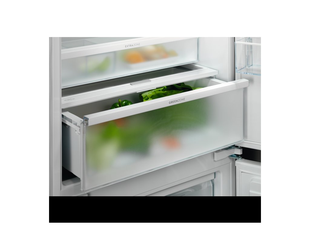 Předností vestavné kombinované chladničky Electrolux ENG7TE75S je speciální utěsněná zásuvka GreenZone. Disponuje spoustou místa pro uložení velkého množství ovoce a zeleniny, které dokáže udržet mnohem déle čerstvé. Dochází zde totiž k řízené kondenzaci; přebytečná vlhkost je eliminována a udržuje se pouze její optimální úroveň. Díky tomu potraviny tak rychle nepodléhají zkáze. Věděli jste, že při ideální míře vlhkosti je možné zachovat až 95 % vitamínů? Na chladničce je také unikátní, že na její výrobu byly použity recyklované plasty z vyřazených ledniček. Tento proces napomáhá snižování množství odpadu a má příznivý dopad na životní prostředí.