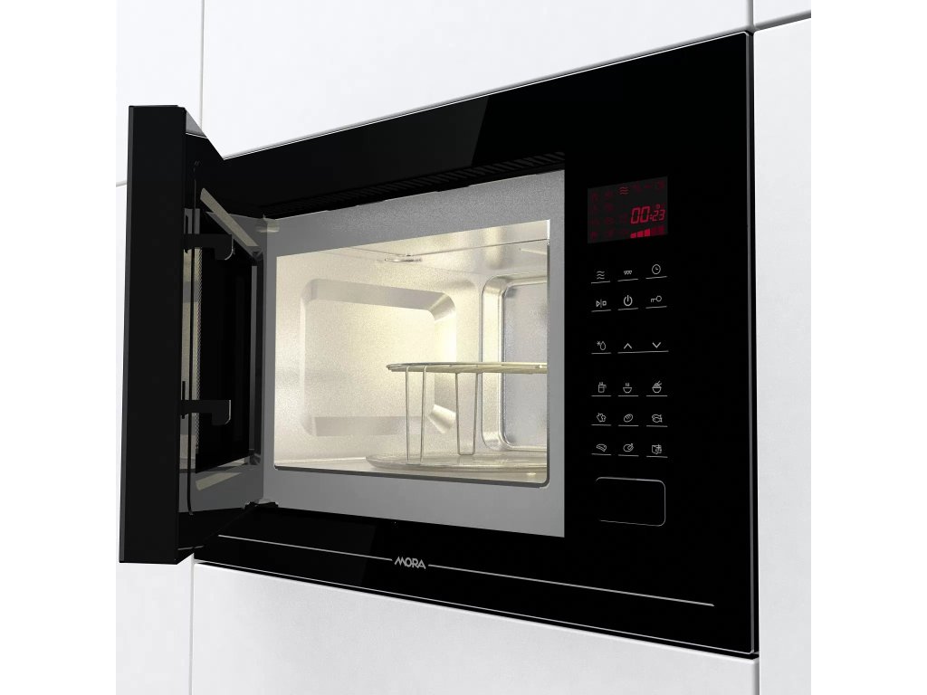 Vestavná mikrovlnná trouba MORA VMT 745 B v provedení černé sklo je neocenitelným pomocníkem v každé domácnosti. Díky spojení výhod mikrovlnného ohřevu a grilu zažijte zcela nové dimenze vaření. Budete ohromeni rychlejším ohřevem nebo pečením menších kousků masa, pizzy a dalších pokrmů, které je třeba upéct do křupavé dokonalosti. Dotykové ovládání s 5 výkonovými stupni potěší svou jednoduchostí. V nerezovém vnitřku trouby o objemu 25 l je umístěn otočný talíř s průměrem 315 mm. Neustálé otáčení otočného talíře umožňuje mikrovlnám efektivně a rovnoměrně ohřívat jídlo, které připravujete, bez jakýchkoli studených míst. Vnitřek trouby lze jednoduše vyčistit díky AquaClean funkci. Otvírání mikrovlnné trouby je do boku.