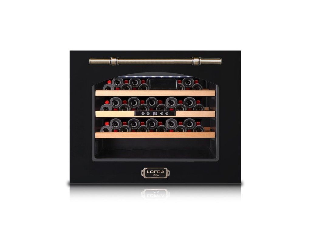 Vestavná vinotéka Lofra ZBRNM24M/A Dolcevita , barva černá, povrchová úprava doplňků mosaz, maximální počet láhví 24 lahví, 1 teplotní zóna s rozmezím 5 °C až 22 °C, LED osvětlení, Rozměr (šxvxh): 59 x 46 x 54 cm.