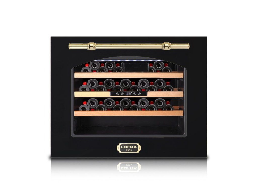 Vestavná vinotéka Lofra ZBRNM24M/O Dolcevita , barva černá, povrchová úprava doplňků zlato, maximální počet láhví 24 lahví, 1 teplotní zóna s rozmezím 5 °C až 22 °C, LED osvětlení, Rozměr (šxvxh): 59 x 46 x 54 cm.