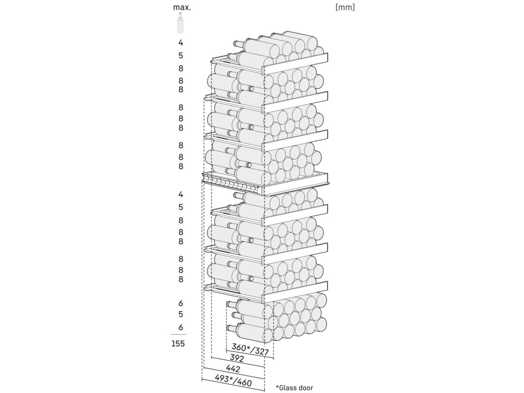Maximální počet láhví Bordeaux 0,75 l ** 155